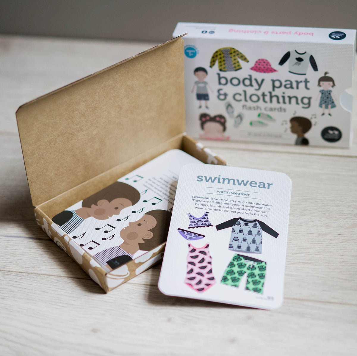 Clothing fun with this set of brightly-coloured illustrated flash cards.