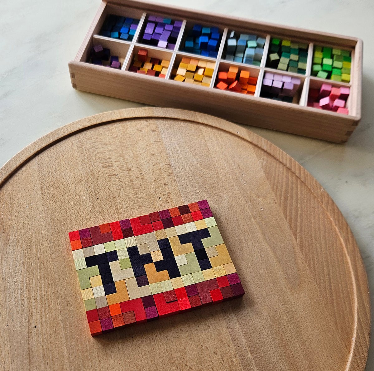 Bloom is a colourful collection of wooden dots and L Shaped wooden forms, we call them corners.