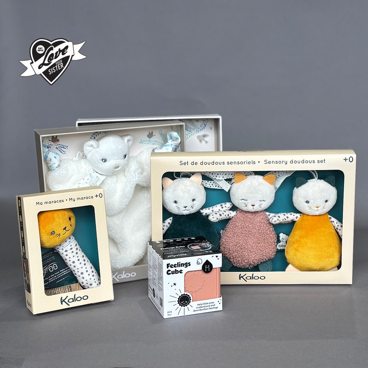 Let baby discover the different textures and patterns on the Kaloo Stimuli Doudou's. Hang them from pram or simply sit them by baby to explore their surroundings and be surprised by what they find. There are crinkly sounds on sleepy cat. High contrast colours and polka dot prints are especially designed for baby's vision capacity.