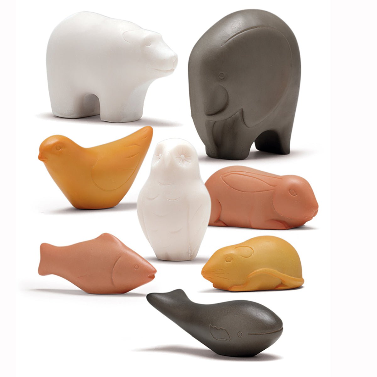 The set consists of eight figures: a bear, an owl, a bird, a whale, a fish, an elephant, a mouse, and a rabbit.