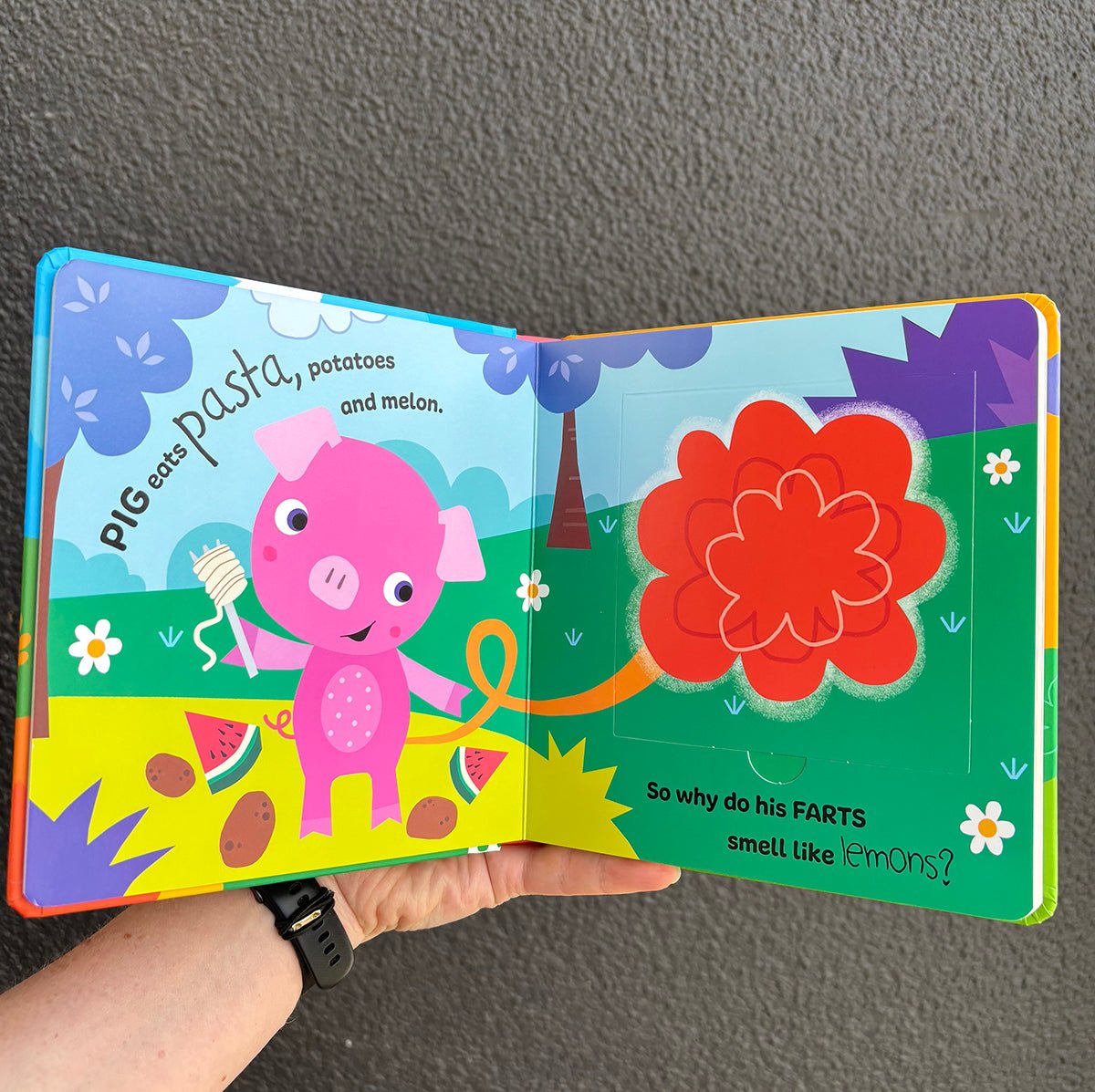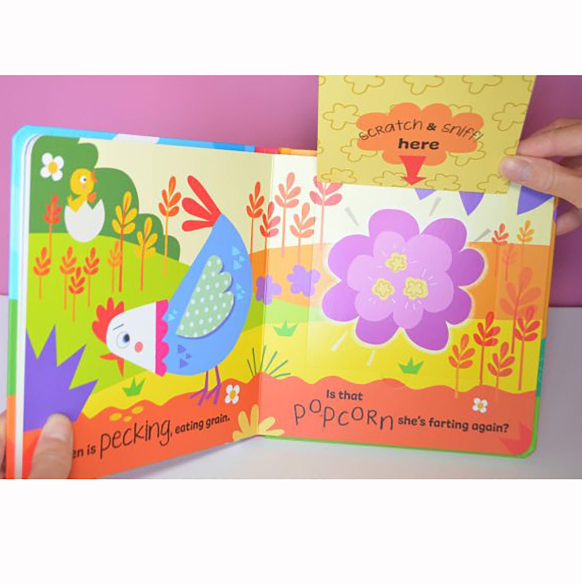 Each spread has a large flap to lift, then you scratch the surface to reveal the smell.