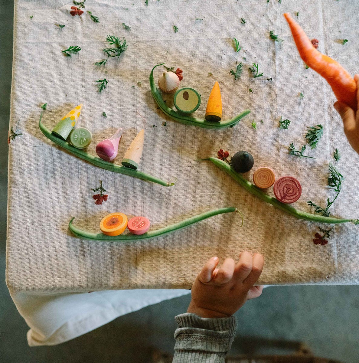 Crunchy carrots, plump tomatoes, and leafy greens invite children to chop, sort, and mix all kinds of meals, encouraging symbolic play.