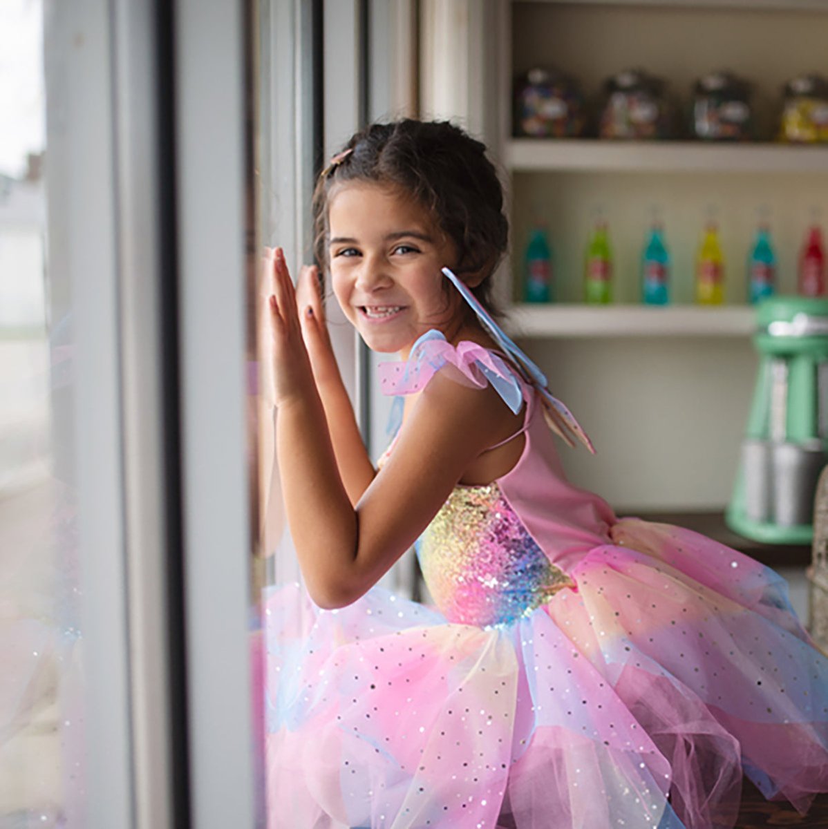 The top is made with rainbow sequinned detailing, with a layered skirt adorned with shimmery organza petals.. Shimmery organza capped sleeves on soft and stretchy straps elevate this into a fabulous party dress, and fairy outfit..