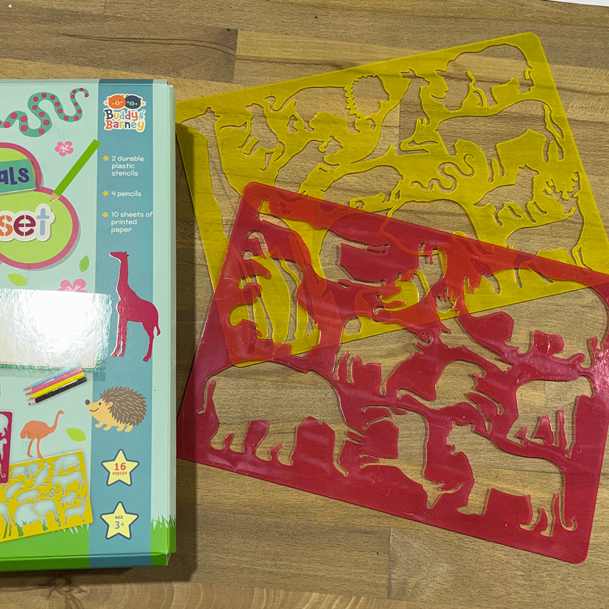 Encourage drawing and a love of animals with this fun stencil set. Through jungles and deserts, with trees so tall, and where lions roar.