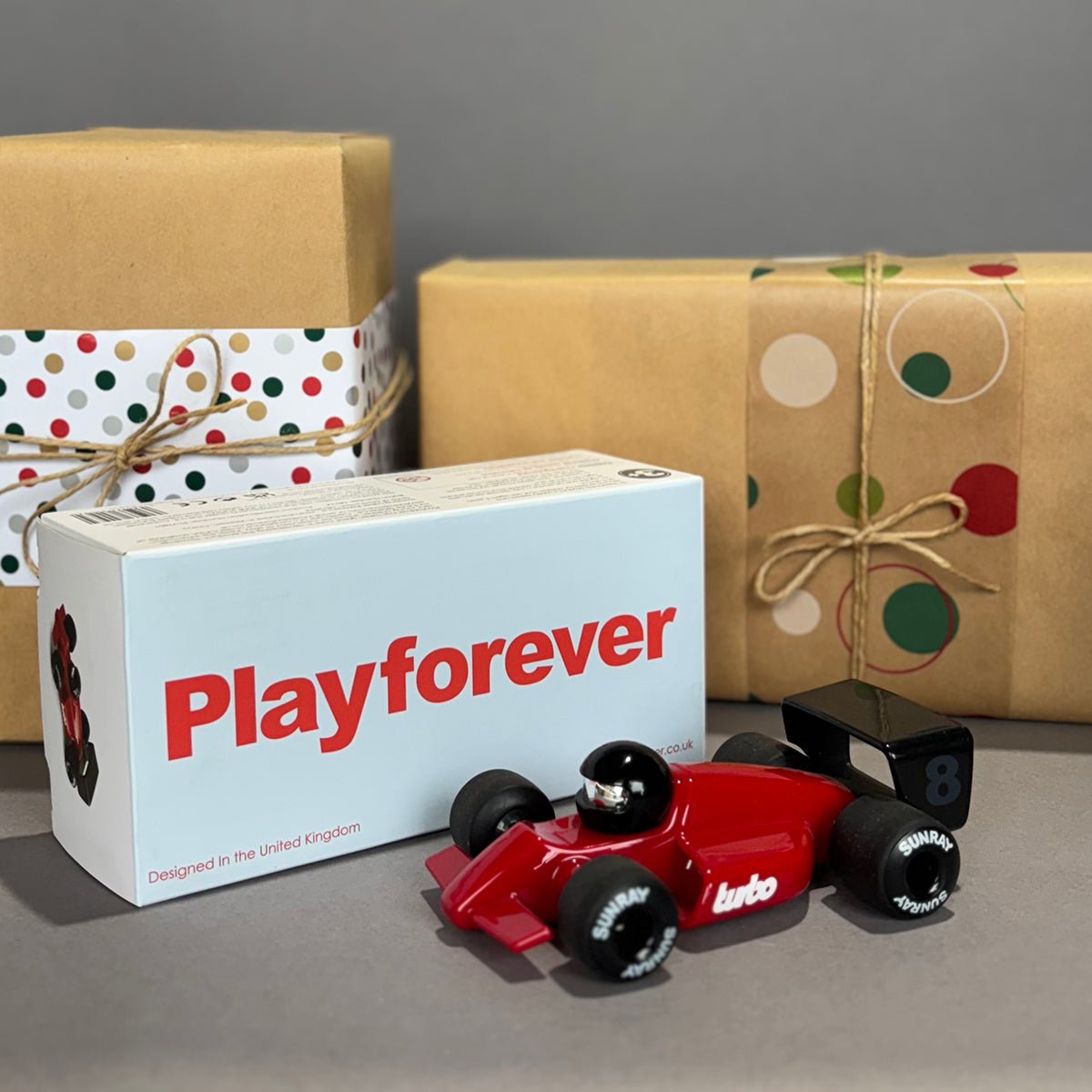With fat wheels, and box wing this Playforever Turbo race car comes straight from the 80's Formula 1 race track.