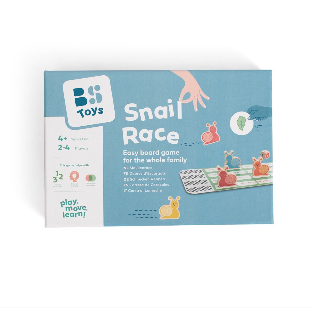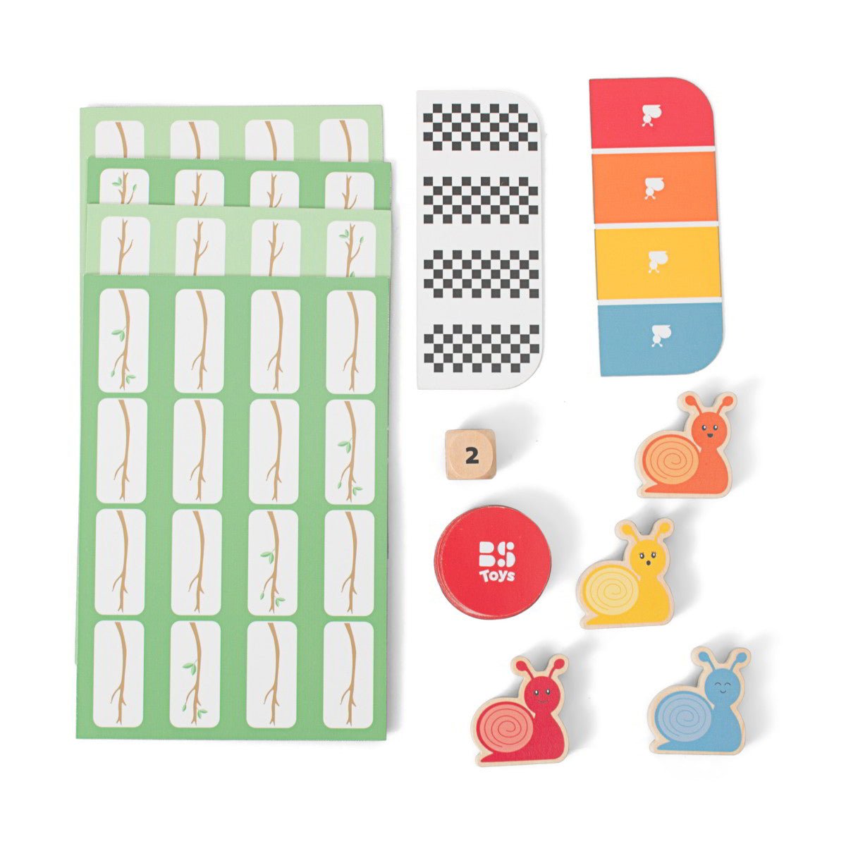 Contains a playing board, 4 wooden snails, 35 action cards and a dice. Board dimensions including start and finish lines: L107 x W16cm. Snails: 5cm high.
