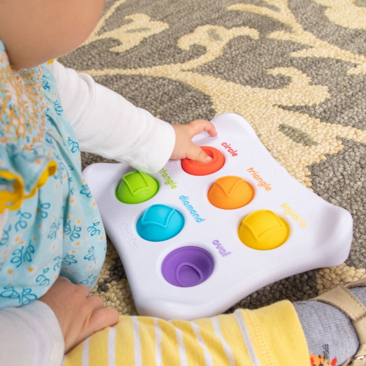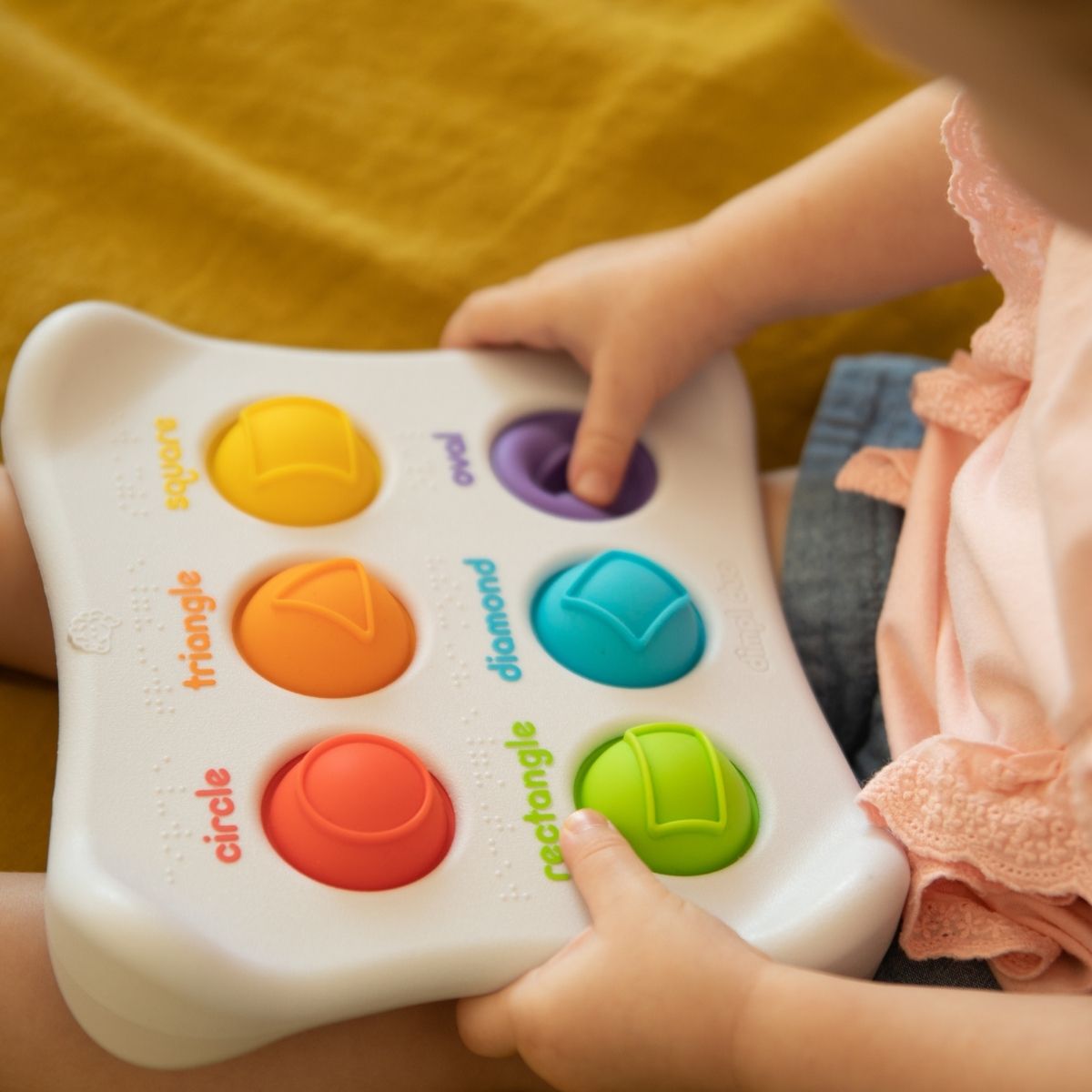 As they get older they will notice on one side, each silicone button is embossed with a different shape and labeled with its matching word in English and in Braille.