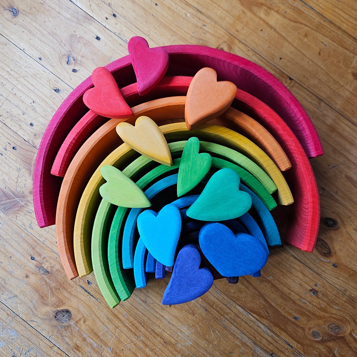 Show your love of wooden toys, balancing and building with this beautiful set of heart shaped blocks in rainbow colours.