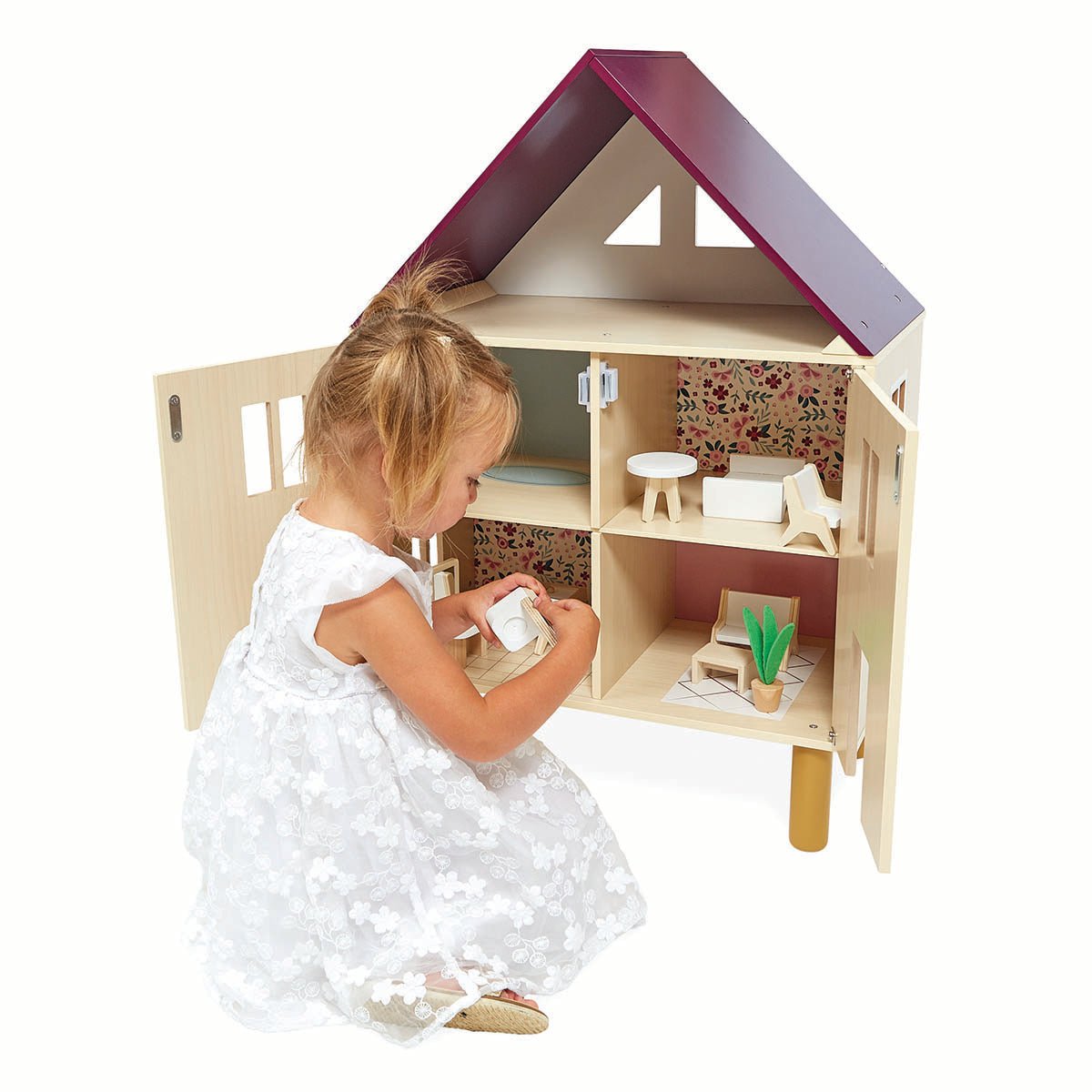 Enter the simply styled wooden house via the magnetic doors that open wide for play and then close to store everything inside for easy transport.