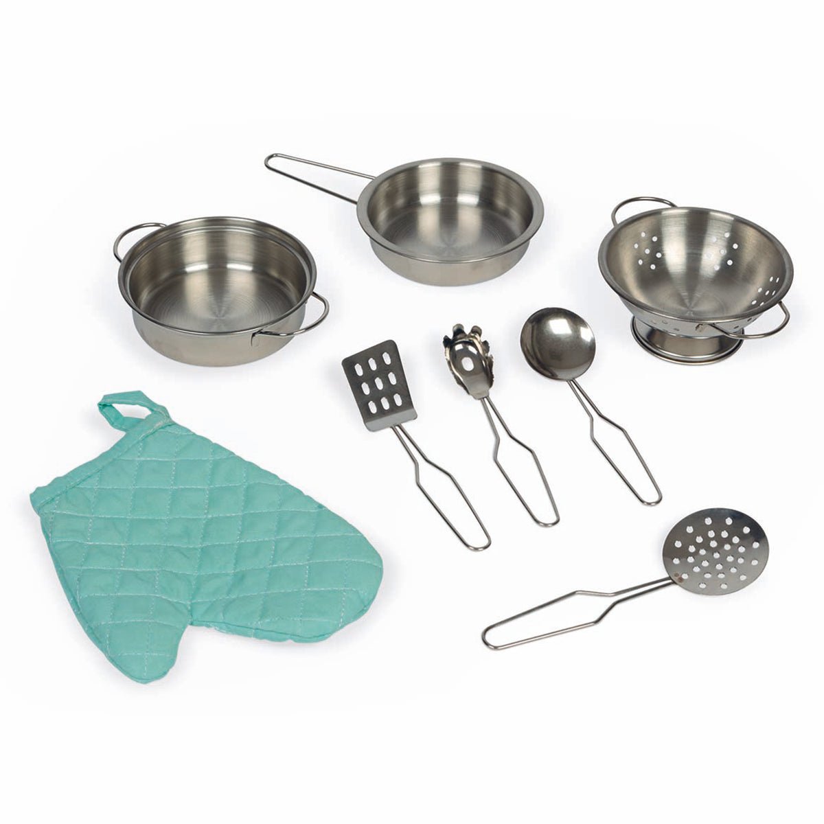 The cooktop will switch off automatically after 30 seconds. The kitchen also comes with metals utensils including a ladle, strainer, egg flip and a pasta server, a saucepan with lid and a colander. It even has an oven mitt so you're ready to cook up a storm!