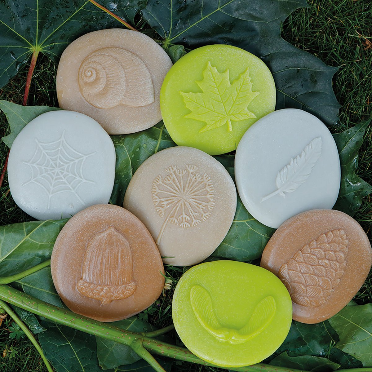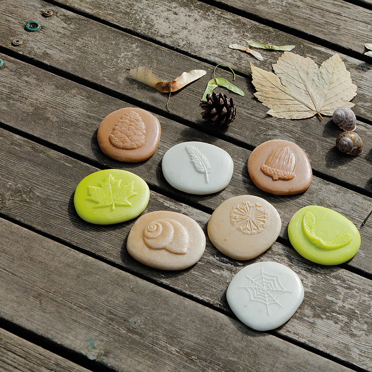 Set contains eight stones: acorn, dandelion seedhead, feather, pine cone, snail shell, spider’s web, sycamore leaf, sycamore seeds.
