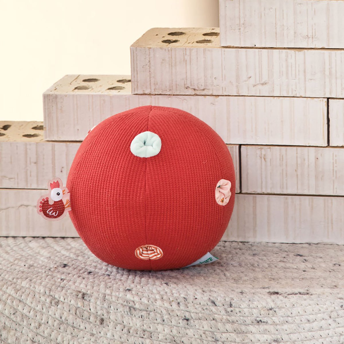This vibrant 15cm red plush ball is sure to captivate babies from 6 months and up. With its delightful rattle sounds and small discovery holes filled with different textured fabrics it's designed to stimulate their senses. Machine washable at 30 degrees on a delicate cycle.