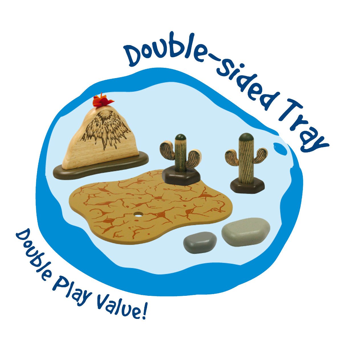 Includes: Wooden environment tray which features 2 different designs: one on each side. 1 small cactus, 1 large cactus, 2 stones, 1 volcano and 1 baby velociraptor